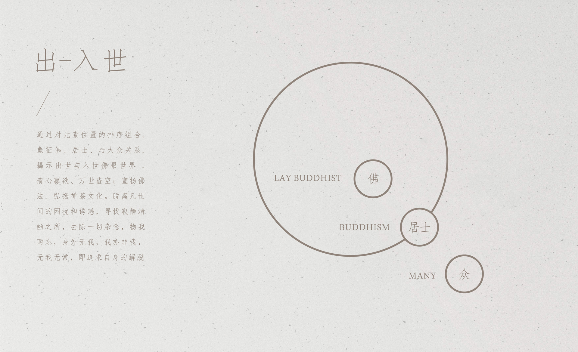 和與德通過(guò)走訪(fǎng)調(diào)研,提煉出出世與入世、禪茶一味等元素,為上海禪茶學(xué)會(huì)設(shè)計(jì)品牌LOGO,體現(xiàn)禪與茶兩種文化的相互滲透相互影響,弘揚(yáng)禪茶文化,茶能謂道,禪也謂境界;通過(guò)對(duì)元素位置的排序組合,揭示出世與入世佛眼世界,清心寡欲、萬(wàn)世皆空,體現(xiàn)出脫離凡世間的困擾和誘惑,尋找寂靜清幽之所,去除一切雜念,物我兩忘,身外無(wú)我,我亦非我,無(wú)我無(wú)常的境界。