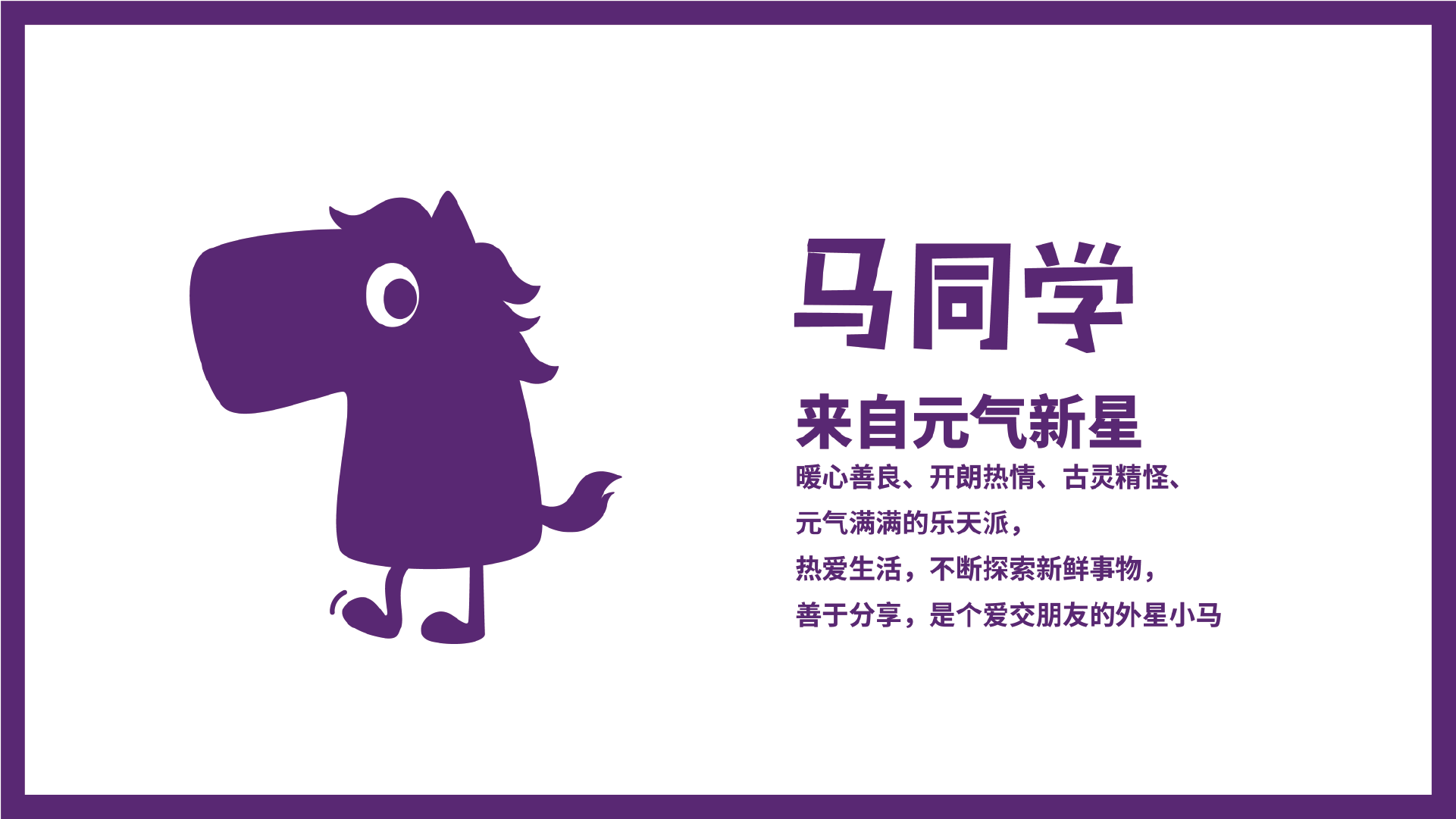 來自元?dú)庑滦堑鸟R同學(xué),是一位暖心善良、開朗熱情、古靈精怪、元?dú)鉂M滿的樂天派。他熱愛生活,不斷探索新鮮事物,善于分享,是個愛交朋友的外星小馬。